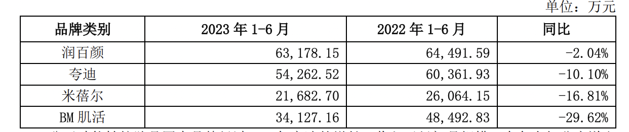 但下滑似乎早有迹象。根据华熙生物2023年半年报,公司功能性护肤品业务实现收入 19.66 亿元,同比下降 7.56%。具体到润百颜、夸迪、米蓓尔、BM 肌活都出现了不同程度的下滑。