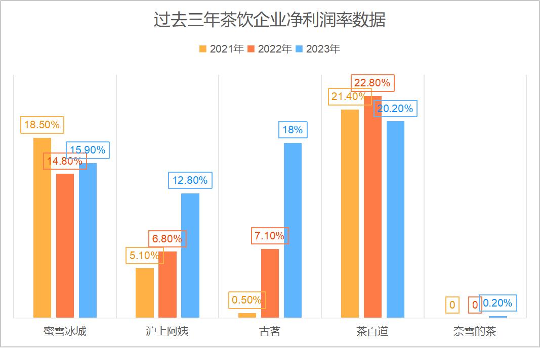 但是,在这一波情绪性地暴跌之外,仔细审视茶百道这家企业的底色,可以发现他们做得并不差。例如,在竞争激烈的茶饮赛道上,凭借对加盟商的服务和重视,他们能够占领6.8%的市场份额,排名第三位;再例如,无论是和之前上市的奈雪的茶,还是和尚在排队的蜜雪冰城、古茗和沪上阿姨对比,茶百道都以超过20%的净利润率领先。