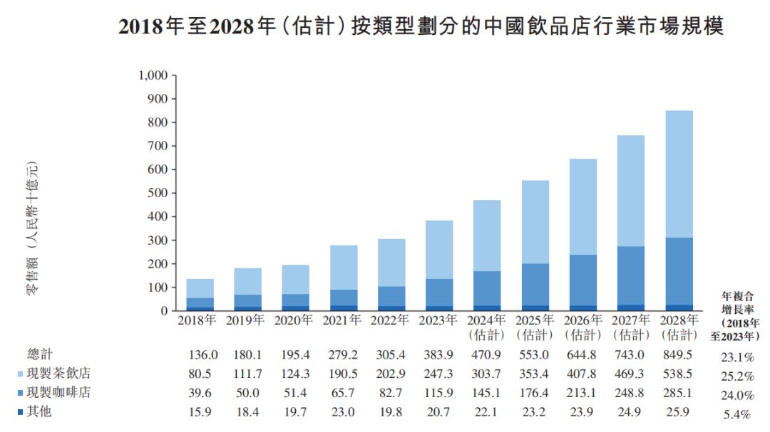 另根据弗若斯特沙利文对于未来市场规模的预计,2024到2028年现制茶饮行业依然有着广阔的前景,年复合增长率会达到15.4%,年均增速的确会下滑一些,但市场规模增长也要接近一倍。可以说,翻遍中国跟“烟酒糖茶”相关的消费品类,无论是白酒、软饮还是茶叶烟草,你很难找到一个像现制茶饮这样还有接近一倍增长空间的了。
