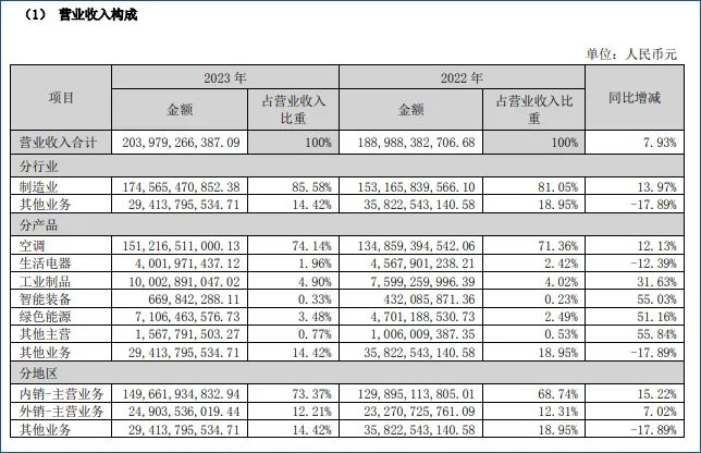 占总营收14.42%、约为294亿元的第二大业务板块为其他业务,据格力官方解释包括了大宗原材料集采与调拨,如钢板、塑胶原料、铜材和泡沫等,可充分利用供应链资源,发挥战略协同与规模优势,有效控制成本。不过,该业务同比2022年营收下降了17.89%。