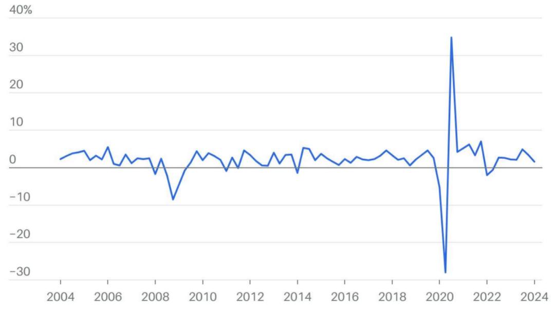 根据美国劳工统计局的数据,从2020年到2023年,美国劳动生产率的年均增长率为1.6%,高于2010年代1.2%的10年平均增长率,但低于1995年至2005年上一次生产率飙升期间的2.8%。上一次生产率的大幅上升主要归功于电脑和互联网的普及以及企业竞争加剧。