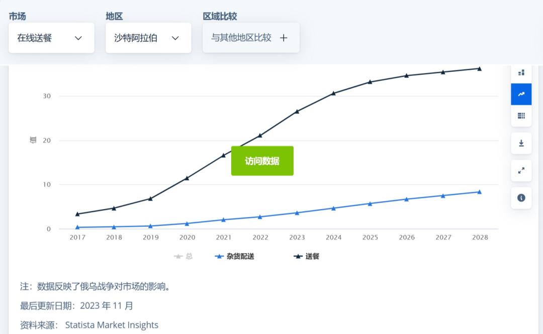 并且,在数字化基建方面,海湾国家中最具活力的两大经济体沙特、阿联酋的互联网渗透率超过99%,分别位居全球第三、第四位;而疫情更急剧加速了中东日常消费与生活方式的线上迁移。Statista的数据显示,在疫情开始的2020年,沙特的外卖收入开始加速增长,目前正以6.02%的复合年增长率迅速扩大市场。