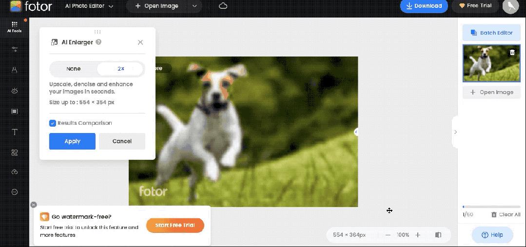 类似工具有很多,我用 Fotor(https://www.fotor.com/)“图像增强”功能做了尝试,让低分辨率的模糊小狗变得高清。