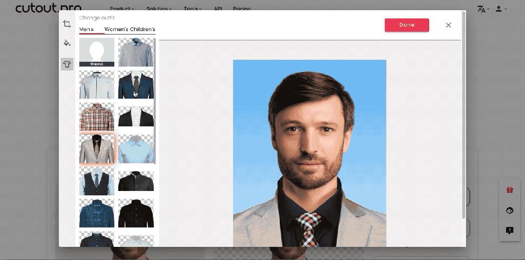 在 cutout.pro “护照照片制作“功能里,你只需要上传图片——定义尺寸——选背景——下载,四步,就能轻松搞定。它额外还有备选“假领子”提供,应付各种条件的证件照足够了。