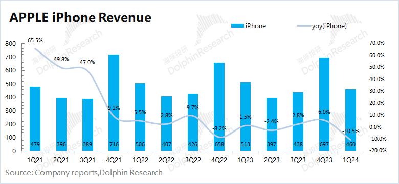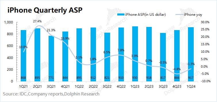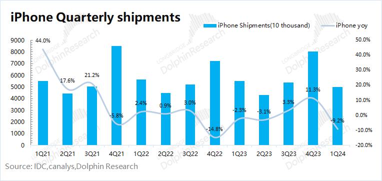 1)iPhone 出货量:根据IDC的数据,2024年第一季度全球智能手机市场同比增长7.7%。苹果本季度出货量增速为-9.2%左右,公司的出货量增长表现明显弱于整体市场;