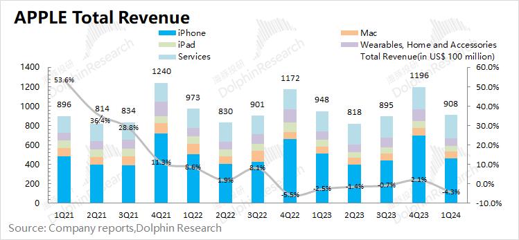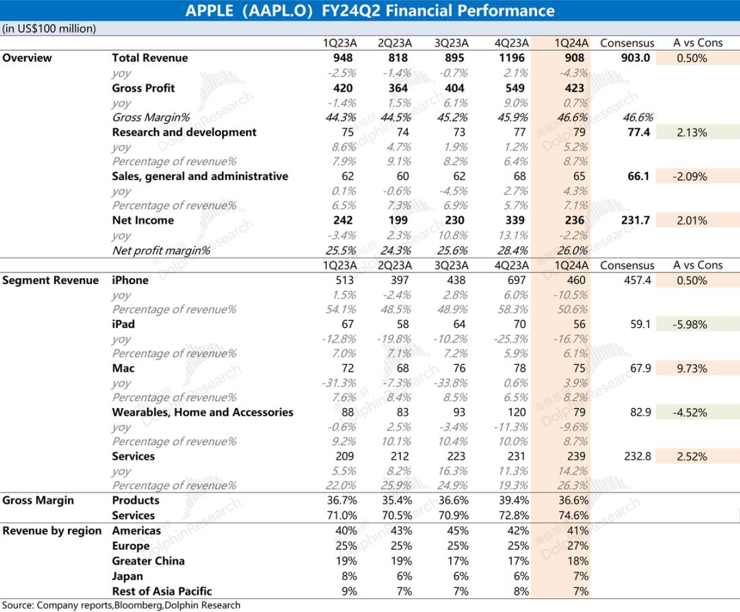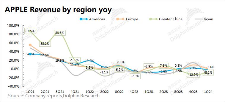 1.1 收入端:2024财年第二季度(即1Q24)苹果公司实现营收908亿美元,同比下滑4.3%,符合市场一致预期(903亿美元)。对于本季度收入下滑,主要是受iPhone及硬件业务下滑的拖累,其中大中华区、日本及亚太地区收入下滑较为明显。