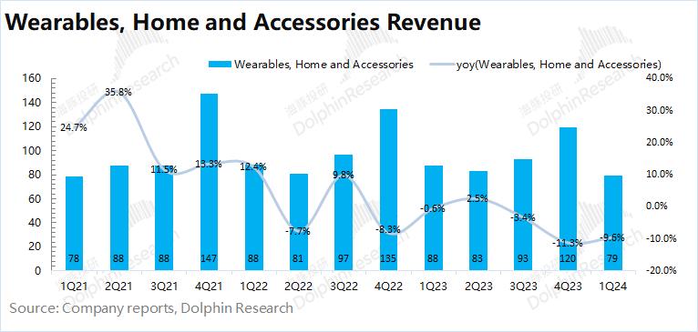 2024财年第二季度可穿戴等其他硬件业务收入79亿美元,同比下滑9.6%,低于市场一致预期(82.9亿美元)。苹果的可穿戴等其他硬件业务本季度继续下滑,主要是由于市场对可穿戴产品的需求疲软导致。结合高通的同比下滑10.6%的IoT业务来看,两公司相关业务均有近10%的下滑,整体市场表现仍然低迷。