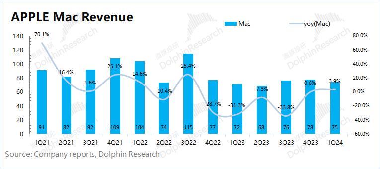 2024财年第二季度 Mac 业务收入75亿美元,同比增长3.9%,硬件业务中明显超市场预期的一项(67.9亿美元)。