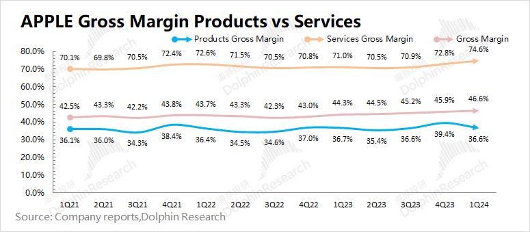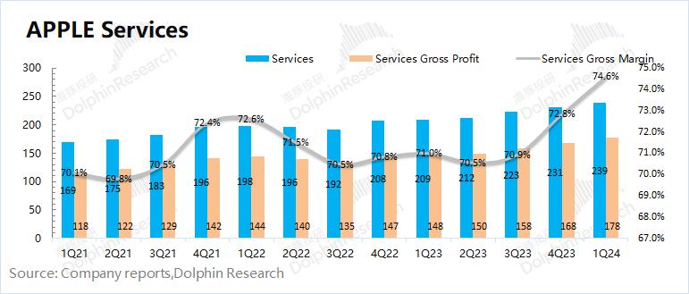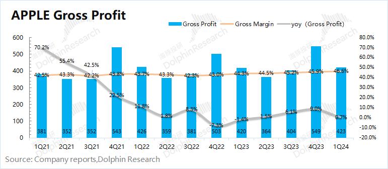 1.2 毛利率:2024财年第二季度(即1Q24)苹果公司毛利率46.6%,同比增加2.3pct,符合市场一致预期(46.6%)。本季度公司毛利率继续回升,主要是因为软件业务走高推动。