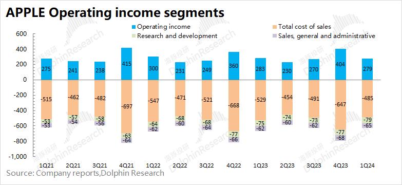 1.3 经营利润:2024财年第二季度(即1Q24)苹果公司经营利润279亿美元,同比下滑1.5%。苹果公司本季度经营利润的下滑,主要是收入下滑的影响。