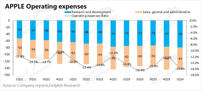 本季度苹果公司的经营费用率15.8%,同比增长1.4pct。本季度公司的销售费用和研发费用同比均有一定的提升。