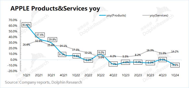 ①苹果公司本季度的硬件业务增速为-9.5%。本季度硬件端的表现,虽然Mac业务有所回升,但其他硬件业务均有不同程度的下滑;