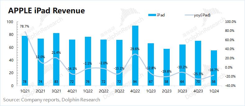 2024财年第二季度 iPad 业务收入56亿美元,同比下滑16.7%,低于市场一致预期(59.1亿美元)。iPad业务的当前下游整体需求疲软,导致该业务收入持续低迷,单季度收入首次下滑至60亿美元以下。