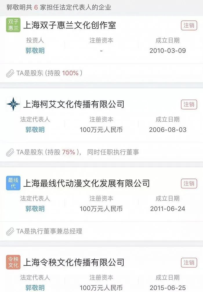天眼查显示,郭敬明担任法人的6家公司中,4家已相继注销;