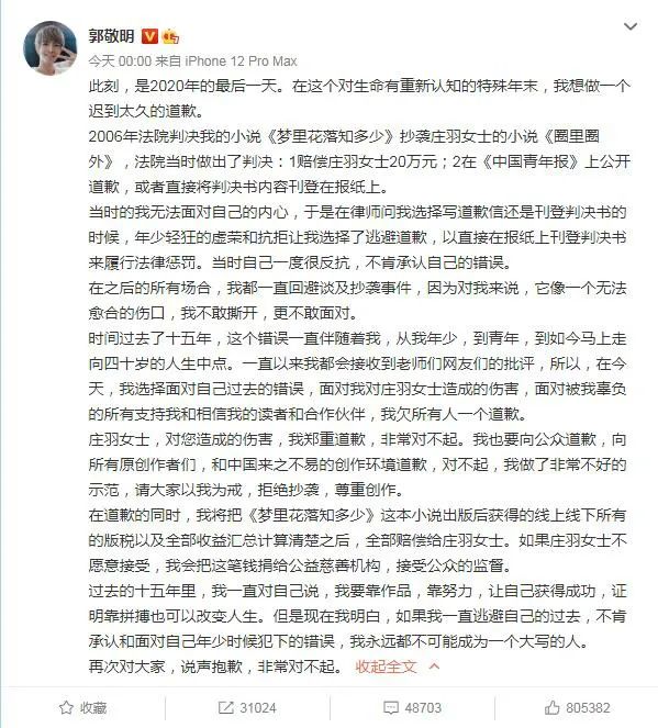 这一次,郭敬明果断选择道歉,态度诚恳,言辞端正。