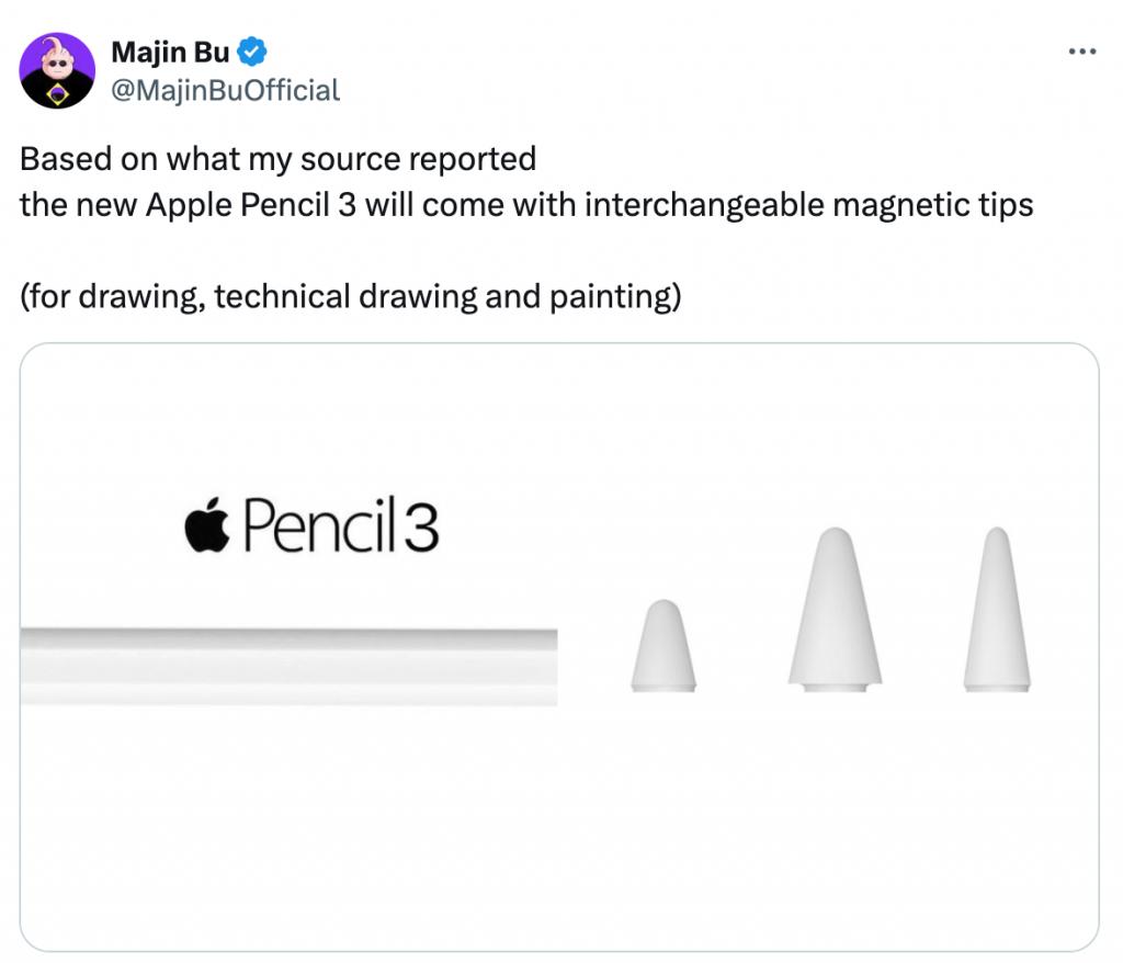苹果爆料 X 推主@Majin Bu 则表示称,Apple Pencil 3 还将推出不同形状和功能的「笔尖」,使用磁性吸附的方式实现快速更换。