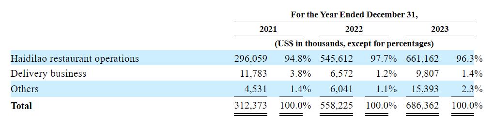 这之中,特海国际的营收有90%以上来自于餐厅经营,其余是配送业务和包括政府补助、存款利息在内的其他业务。值得一提的是,配送业务增长也相对迅速,从2022年的660万美元增长48.5%至2023年的980万美元。