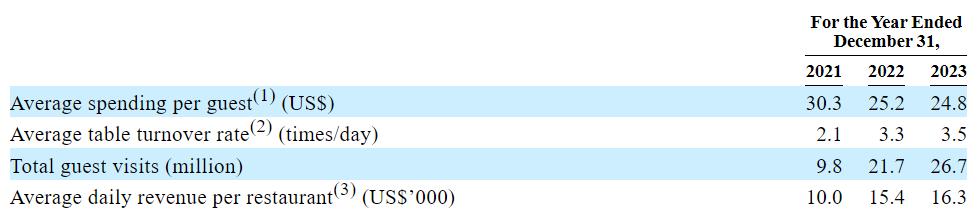 对于前两年的业绩亏损,招股书解释为受疫情影响,许多国家相继取消堂食。此后逐渐恢复正常营业,与此同时餐厅网络也在进一步扩张,每家餐厅的平均餐桌周转率提升,以及内部管理及营运改善等原因,业绩逐步回升。
