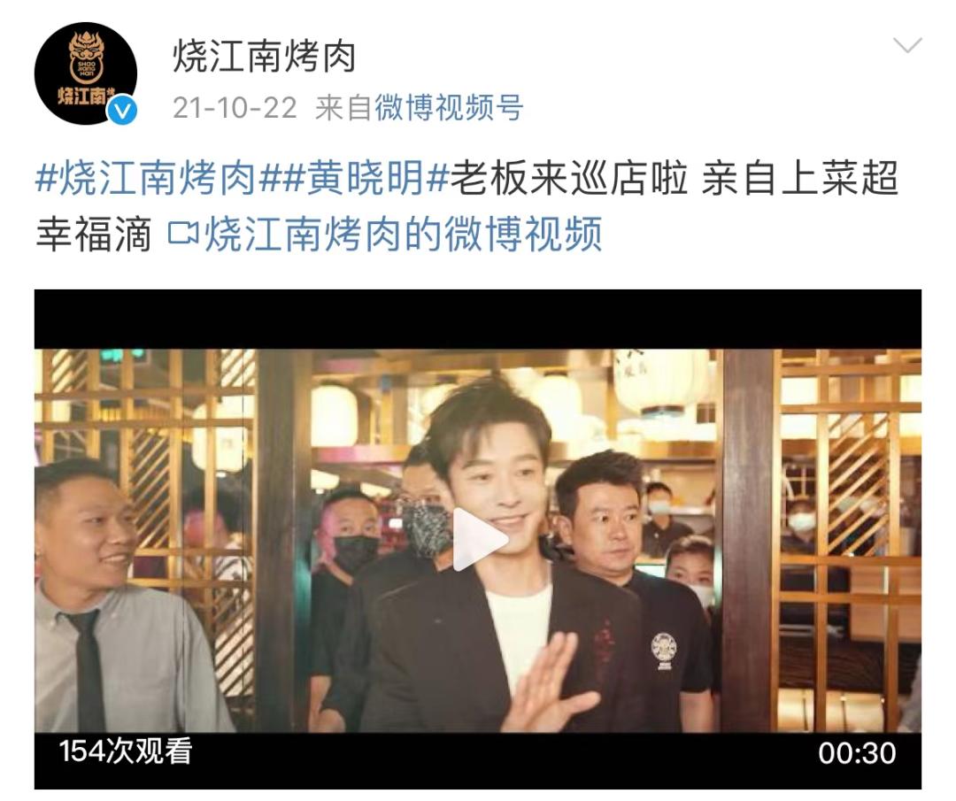 “烧江南”烤肉店曾在2020年11月于成都太古里盛大开业,当天黄晓明亲临现场为品牌站台,官方称黄晓明为其品牌官。此前,江南烧官方账号曾公开喊话黄晓明,表示“老板来巡店,亲自上菜超幸福”。