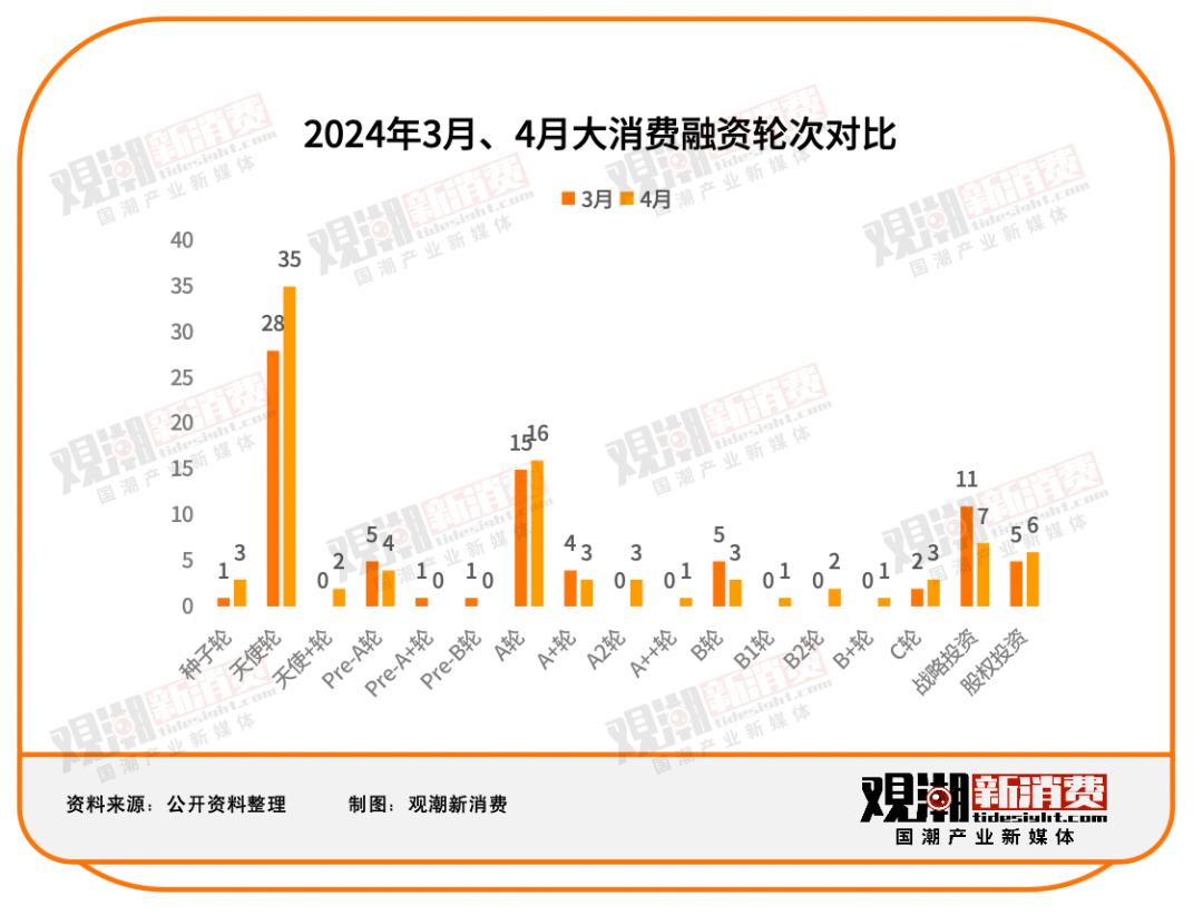 2024年4月,大消费领域投融资事件轮次仍以早期融资为主,其中A轮及以前轮次事件共63起,占比70%。