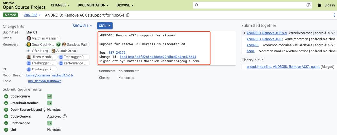 4 月 26 日,Google 高级软件工程师 Matthias Männich 在 AOSP 项目中提交了一个关于“移除 ACK 对 risc64 的支持”的补丁。