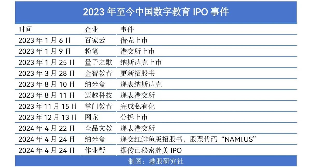 尤其是,从2023年至今,国内包括粉笔、量子之歌以及近期传闻秘密计划赴美上市的作业帮等多家教育行业机构的再资本市场中的新举动,或许也进一步说明了行业正在加速确认“低点”,甚至想要有所复苏。相比之下,22年A股和港股中仅有数字化教育硬件供应商点读机上市了。