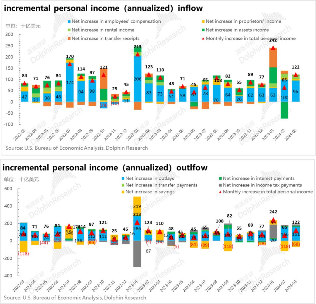 而在最为关键的第一项——当期的挣钱能力上,可以看到居民名义收入的第一大源泉——雇员报酬,在高增的就业率之下,一直扮演着压舱石的角色,月收入(年化)的增量来源稳定增长。
