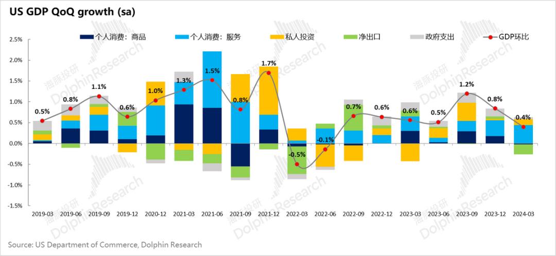 一季度GDP环比0.4%(其实就是媒体报道折年同比1.6%),本来市场预期是至少同比能有2%以上的增速,差不多能够比去年四季度的2.2%持平或加速一些。