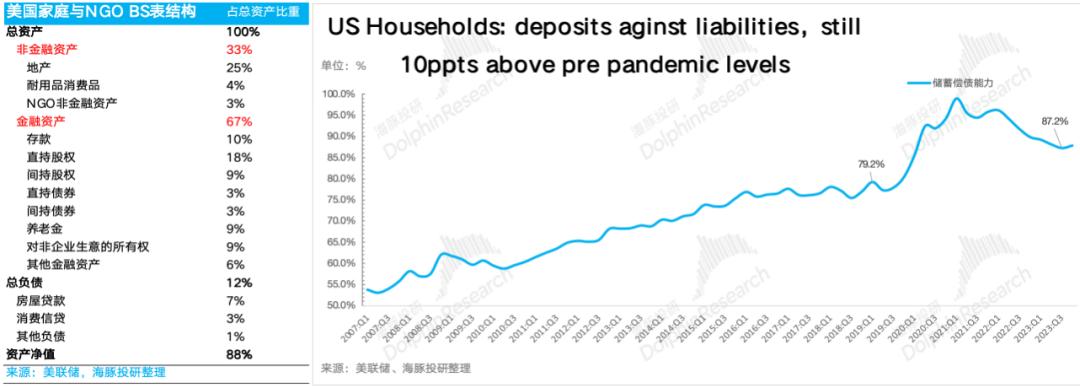 而在后两项上:这波美国经济调整到现在,高息之下,以地产为主的非金融资产基本没有掉价,金融资产中以存款形式存在的资产基本以升值为主,而存钱本身余额高,而且相对负债的偿付能力又尤其强。加息到目前影响的主要是举债类消费的增量(房、车),其他基本无影响。