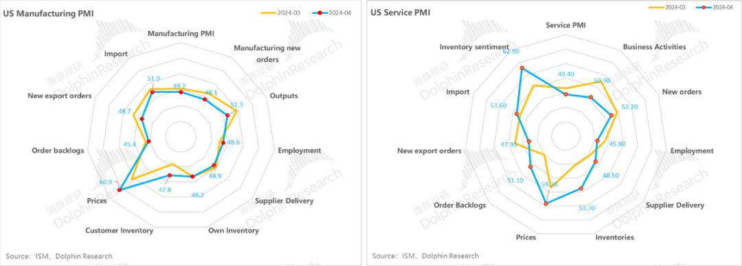 b. 制造业景气度小幅回落,再次回到50以下,但是服务业和制造业的物价指数分项仍然较高,似乎不支持下半年太高的降息预期。