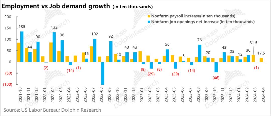 a. 单月新增非农就业回落到17.5万,同时3月,企业终于不再净新增岗位了,劳动力市场供需更趋平衡。失业率小幅提升,隐含着经济并非是过热性通胀。这种经济数据并不支撑长债收益率攀升到4.5%-5%的区间。