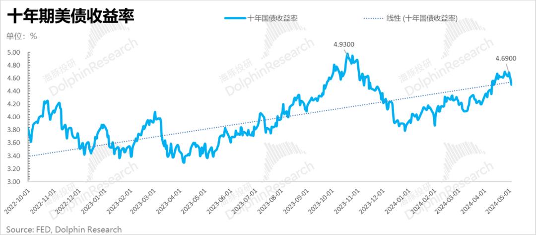 而五一期间,美债收益率的回落和美股的回升,就是这个逻辑从高峰下行的过程。而当前大宏观背景下的美国经济,对应的美债收益率大概率还是在4-5%的区间震荡,以及这个震荡当中,股价调整中的机会。