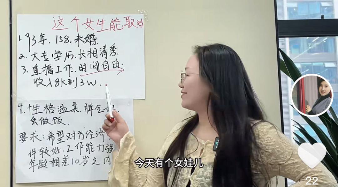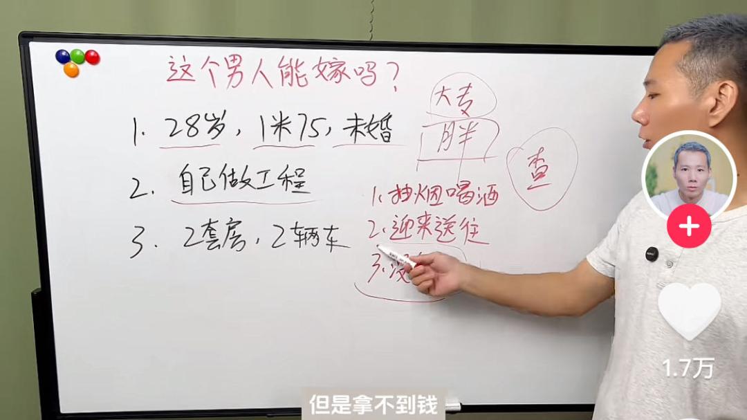 “王婆说媒”的热度还没散去,在短视频平台上,最近冒出来一群“相亲分析师”。一面白板,一支油性笔,三言两语就能把相亲市场上的“高质量男青年”“优质女嘉宾”扒得干干净净,让隐藏的“渣男渣女”无处遁形,起码能帮你避开相亲路上80%的坑。