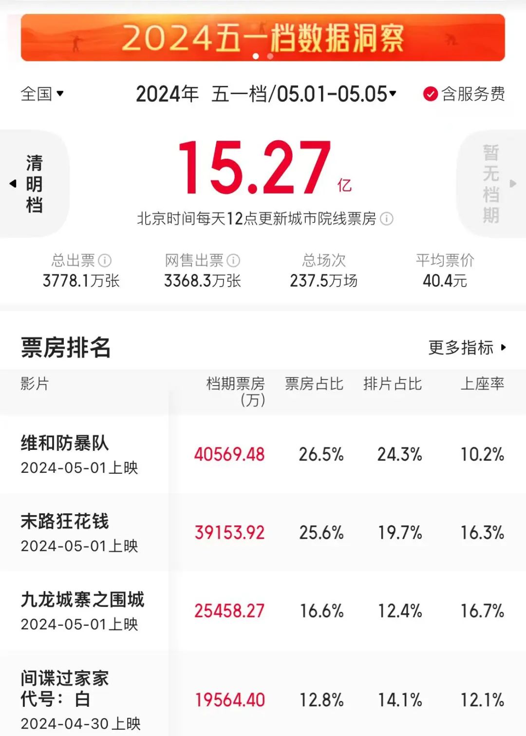 15.27亿票房,3777.5万观影人次,5部影片破亿,今年五一档发挥稳定,没有太多惊喜,但也不如之前大家所预期的那般“惨烈”,票房和观影人次都维持了和去年差不多的水准,《维和防暴队》《末路狂花钱》《九龙城寨之围城》等影片的总票房预测落点都超过了映前预测,在旅游热、演出热的夹击下,电影仍然是一种娱乐“刚需”。