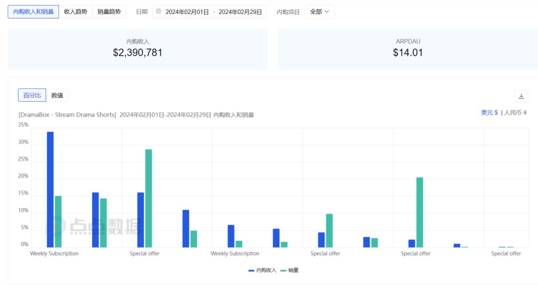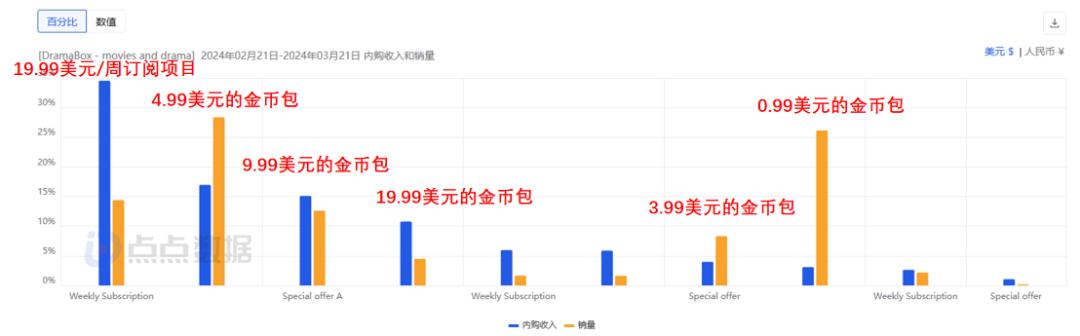 DramaBox内购项目收入和销量情况 | 图源:点点数据