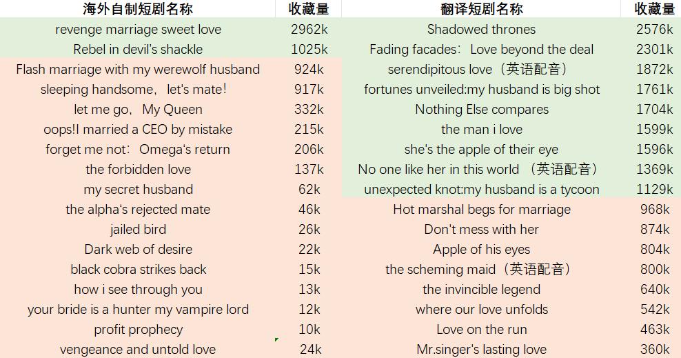 DramaBox 坐拥数千万人民币的月流水,其中过半收入来自美国,而用户消费最多的是翻译短剧。根据点众科技执行总裁李江对外公布的数据,DramaBox 上线短剧 300 部,海外自制约 20 部,翻译短剧占比超 9 成。从收藏量来判断,虽然目前平台上最热门的是一部名为《Revenge marriage sweet love》的海外自制剧,但翻译短剧一边并不缺少人气在同一量级的作品;并且相较于收藏量断层明显的海外自制短剧,几十万到百万收藏量的翻译短剧作品更多,参考整体收藏量的话,DramaBox 上翻译短剧的整体人气应该是海外自制短剧的 3-5 倍,前者几乎毫无疑问是平台用户的主要消费内容。