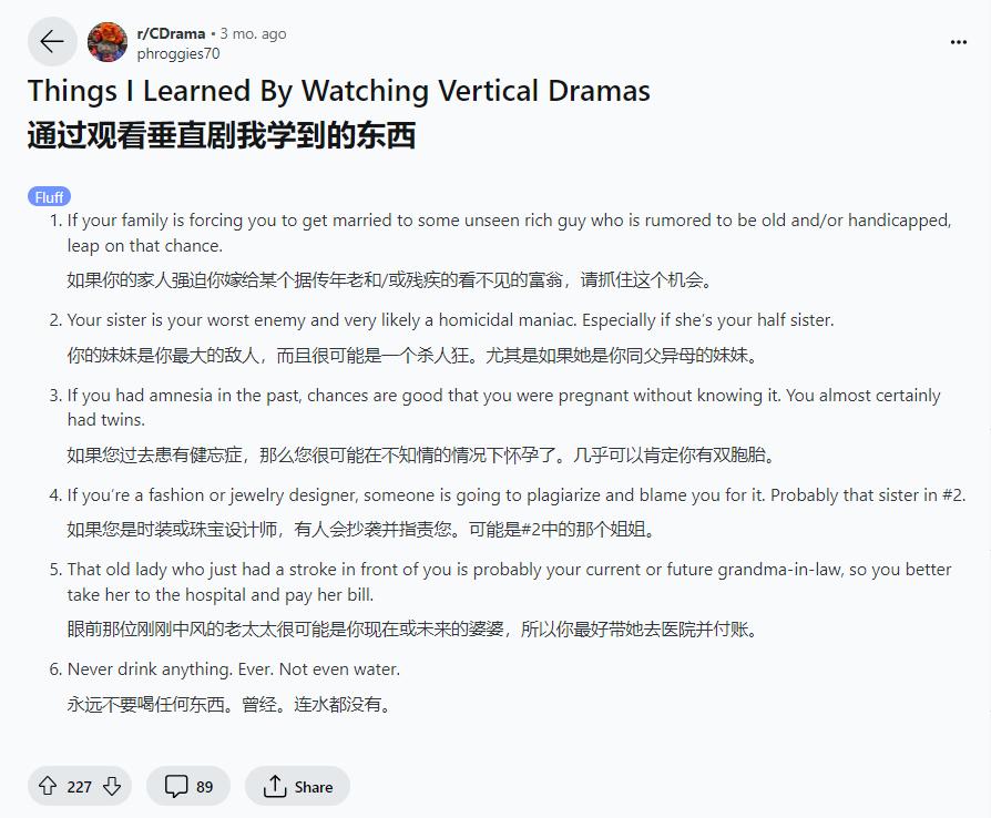 第一次注意到这一群体是在一个名为 C-Drama 的 Reddit 社群中,一位用户在给另一位用户推剧,后者表示,自己太喜欢竖屏短剧了,已经 1 个半月都没看过普通长剧。