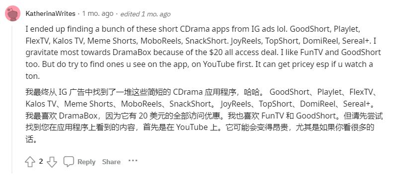 对短剧出海产品如数家珍的海外国剧粉丝|图片来源:Reddit