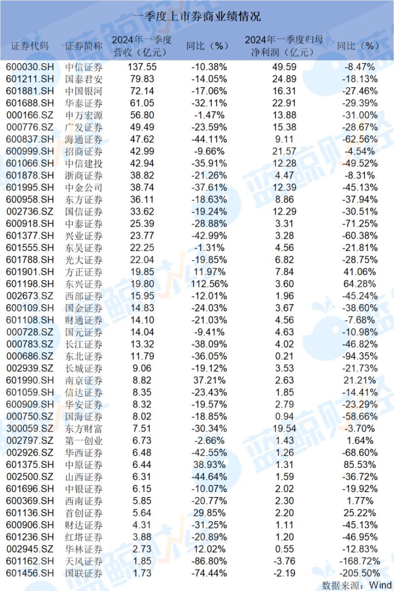 上市券商一季报披露收官,业绩下滑和分化成为主基调。