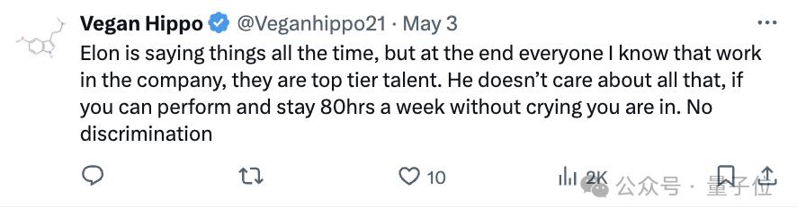 但是不管怎么说,根据此前马斯克所说的人才标准来看,这位网友道出了“实情”: