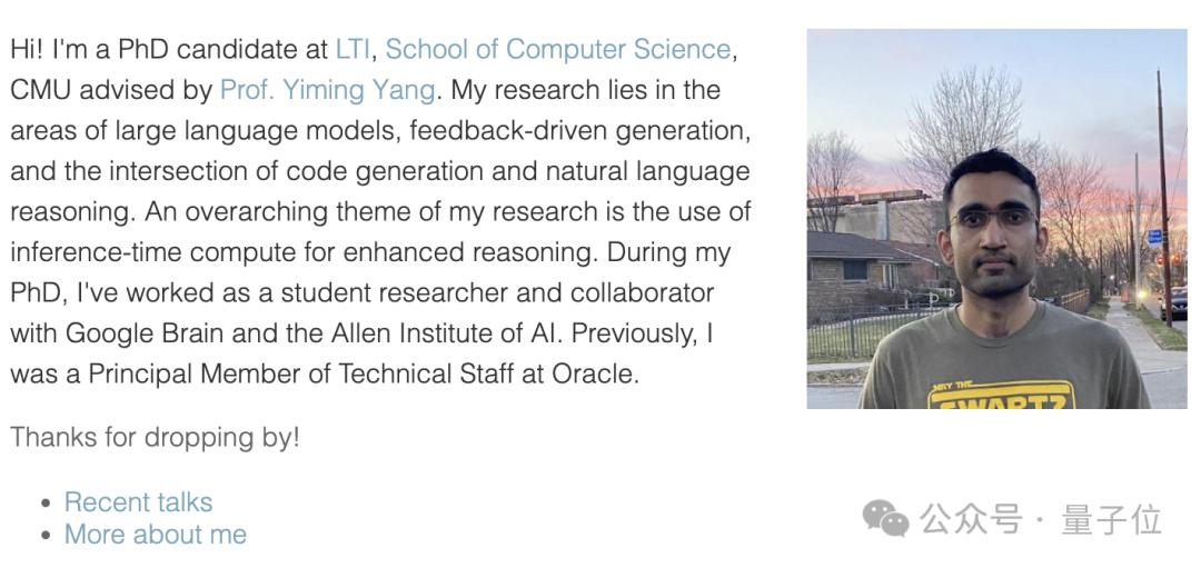 他的研究领域包括大型语言模型、反馈驱动的生成以及代码生成和自然语言推理的交叉领域,研究的首要主题是使用推理时间计算(Inference-Time Compute)来增强推理能力(Reasoning)。