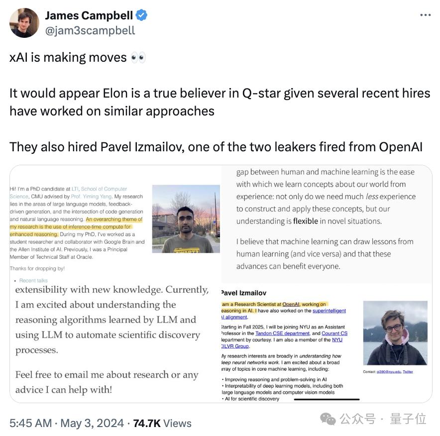 而且其中还有数人研究方向与OpenAI最神秘的Q*算法有点关系,看来马斯克才是Q*的真正信徒。