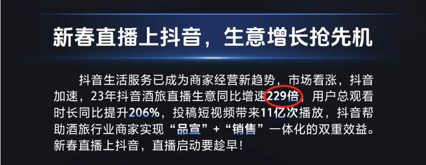 这番言论并非只是说说而言,年初抖音发布的行业月刊显示,2023 年抖音酒旅直播生意相较前一年同比增速是 229 倍。