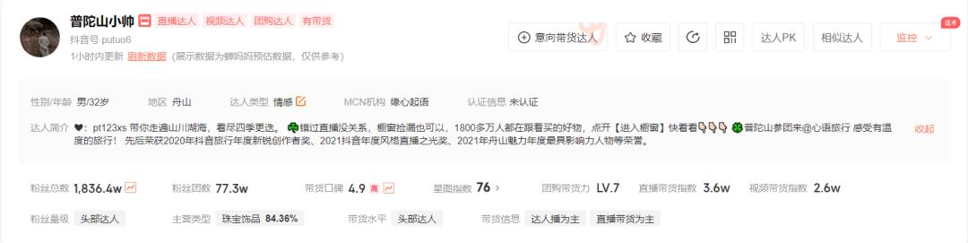 无独有偶,抖音上爆火的 @普陀山小帅 也是一位导游型网红。小帅通过讲“心灵鸡汤”走红,其在抖音上已经拥有了 2054 万粉丝,所在旅行社一年接待游客 2 万人,全部都来自于线上。