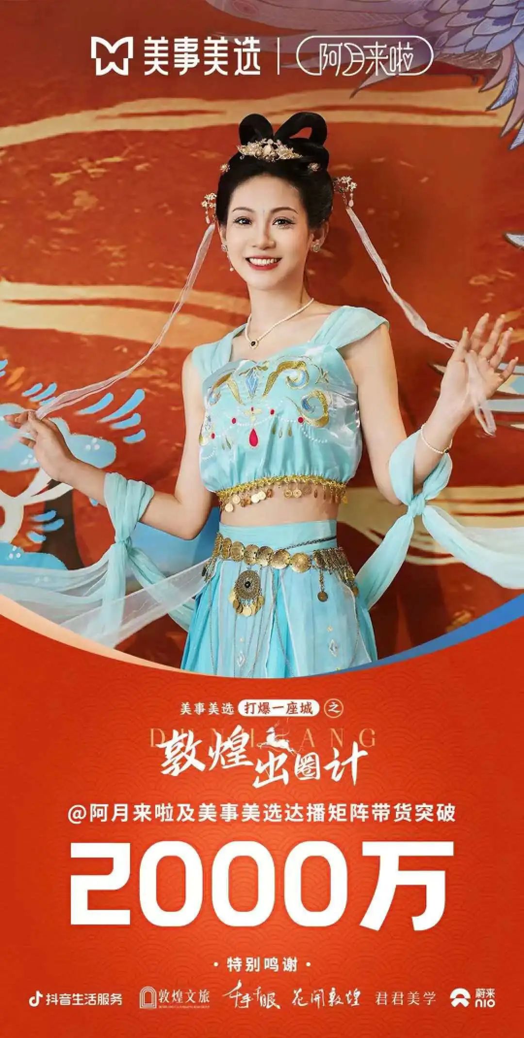 @阿月来啦 是抖音的头部团购带货主播之一,她最初靠餐饮探店内容涨粉,如今不仅带货餐饮团购,也经常会开旅游专场直播,去年她举办了一场敦煌旅游专场带货,GMV 突破 2000 万元,打破其个人直播间带货记录。