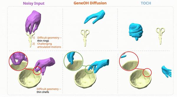 GeneOH Diffusion 主要用于改善手和物体交互(Hand-Object Interaction, HOI)过程中的噪声问题。简单来说,就是当机器或者计算机视觉系统尝试追踪和理解手和物体之间的交互时,经常会因为各种原因(比如遮挡、光线变化等)出现误差。这篇论文提出的技术就是用来减少这些误差,使得机器能够更准确地理解和模拟手与物体之间的交互。
