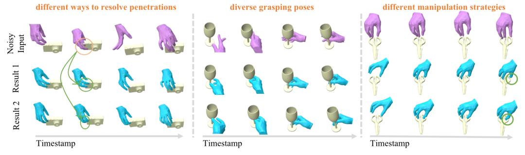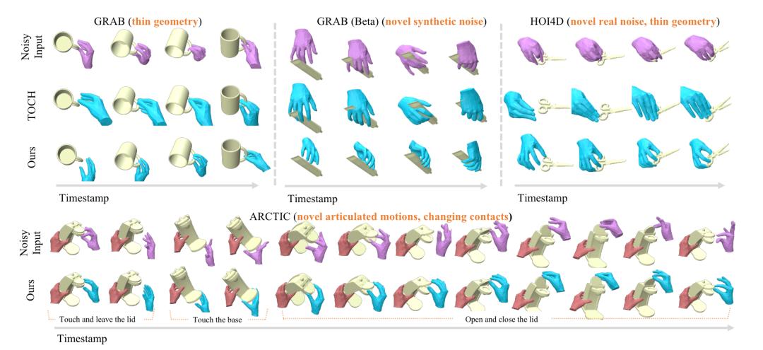 GeneOH Diffusion 仅在有限的 GRAB 数据集上进行训练,尽管它只接触过有限的交互序列和简单的扩散模型中的高斯噪声,但它仍然能够有效地泛化到新的交互序列上。这些新序列不仅包含了未见过的物体,还涵盖了创新的交互动作,并且带有复杂的、真实世界中的噪声特征(见图 5)