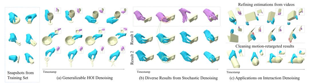 图 2:通过在有限的数据上进行训练,GeneOH Diffusion 可以很好地泛化到新颖的带有复杂噪声特征的交互序列上(图 a),并可以从一段输入中恢复出多样且自然的交互序列(图 b),且是一个实用的工具(图 c)。
