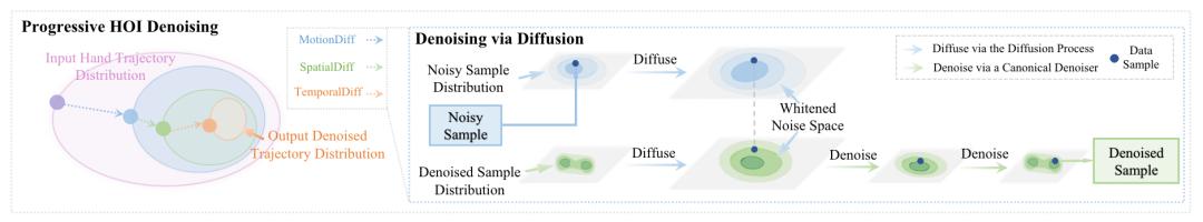 为了增加去噪模型泛化到新噪声分布上的能力,GeneOH Diffusion 摒弃了前人确定性映射的去噪方法,提出使用扩散模型刻画手物交互信息的分布,并通过先扩散 — 后去噪的方式,极大地提高了模型对具有没见过的复杂噪声特征的数据的泛化能力。
