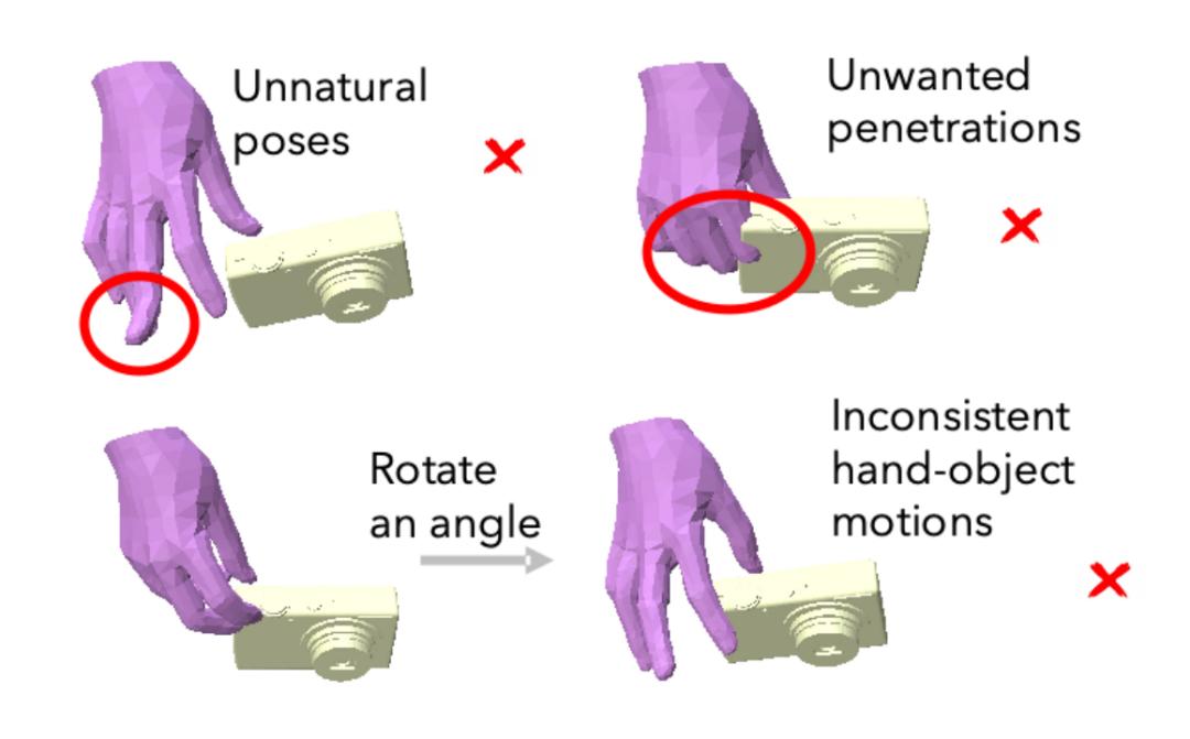 干净的手物交互数据在很多下游任务,如 AR、VR 和 Robotics 中都有广阔的应用前景,但如何以一种可扩展的方式获取自然真实的手物交互数据是一个极具挑战性的问题。研究者无论是采用数据采集的策略,设计算法从其他数据模态中获得手物交互序列,还是借助生成模型的强大生成能力,所得到的数据都不可避免地被各种各样无法预测的噪声干扰(图 1)。这些噪声可能来源于采集设备有限的精度或者相关算法的误差。
